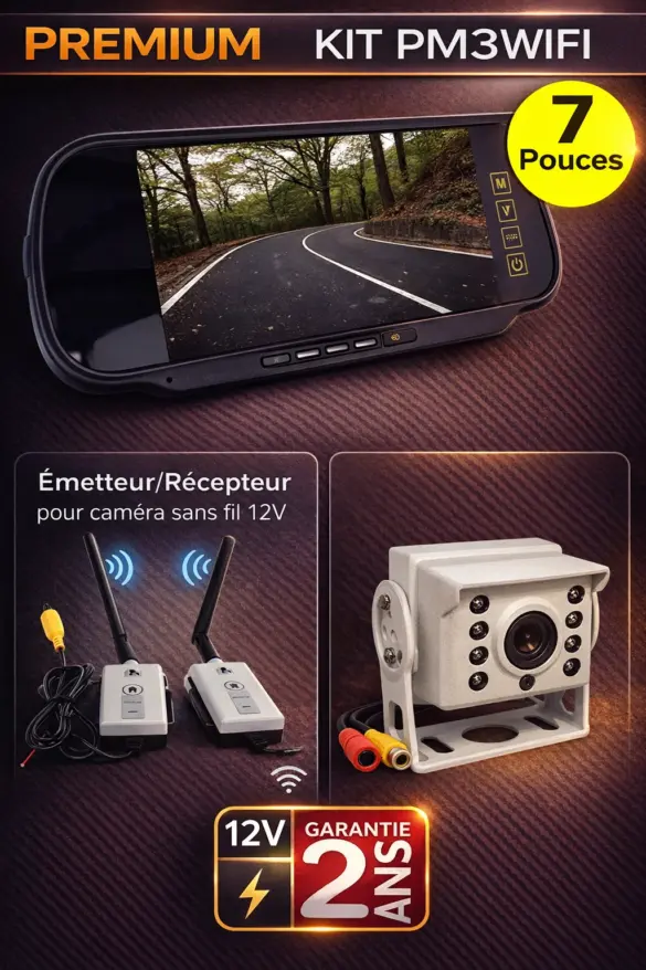 Ce système vidéo couleur d'aide au stationnement est équipé d'une caméra, avec angle de vision de 120°, un écran 7" à clipser sur le rétroviseur intérieur de votre véhicule, une télécommande et émetteur / récepteur Wifi inclus.