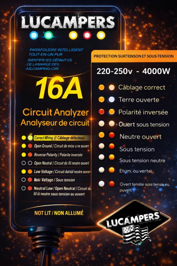 - [Protection de l'alimentation] Parasurtenseur de Camping-car de 16 amp, identifie la puissance de parc de RV défectueuse, donnez à votre équipement le parasurtenseur. Protège votre camping-car ou van contre les hautes tensions dangereuses et les sous tension, les interférences électriques et les surtensions causées par la foudre.